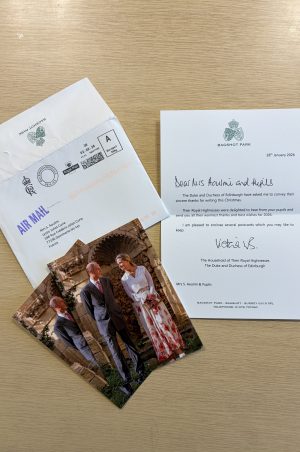 Les élèves de la classe de 1CAPE2 ont en effet eu la grande joie de recevoir une réponse officielle du duc et de la duchesse d’Édimbourg suite à l’envoi de leurs cartes de vœux.