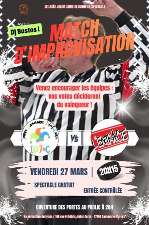 Après le cabaret d’impro du mois de novembre, les joueurs de la IDJoC ont invité l’équipe de l’association dammarienne L’Entracte pour un affrontement dans les règles de l’art au lycée. Toutes les conditions étaient réunies pour assister à un beau match : – le réfectoire aménagé pour l’occasion ; – un staff arbitral bienveillant… mais pas trop […]