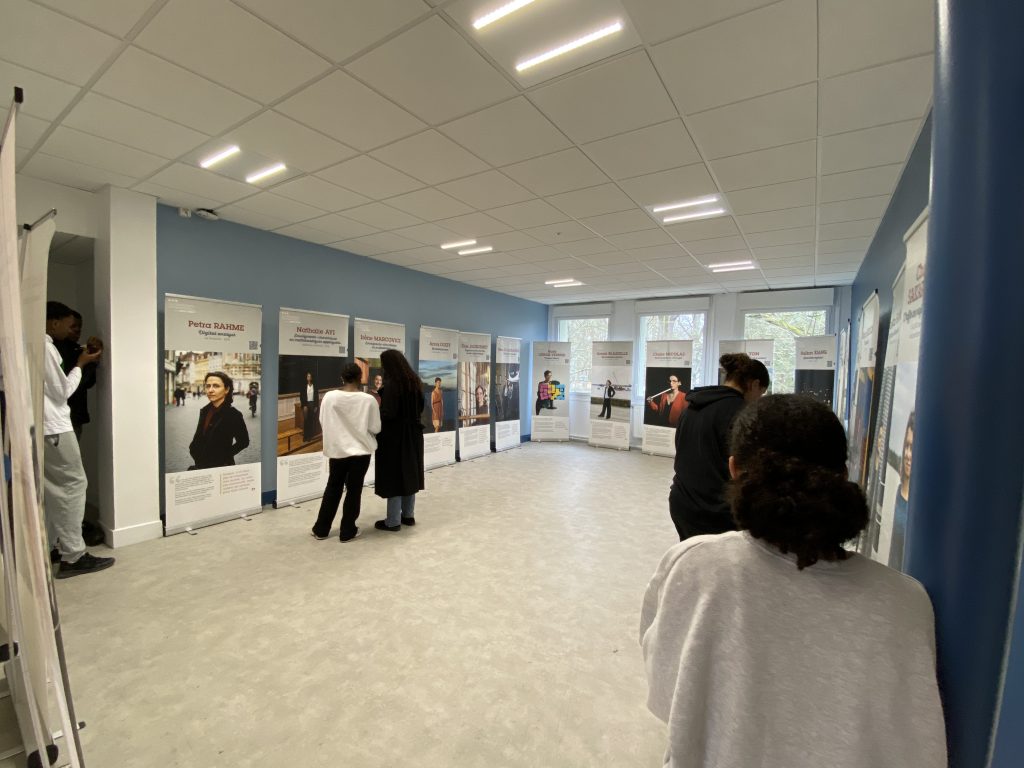 Les élèves, par groupe de deux, ont pris connaissance des 20 portraits de femmes présentés sous forme de kakémonos, se sont concentrés sur un seul puis en ont fait une brève présentation au reste de la classe.
