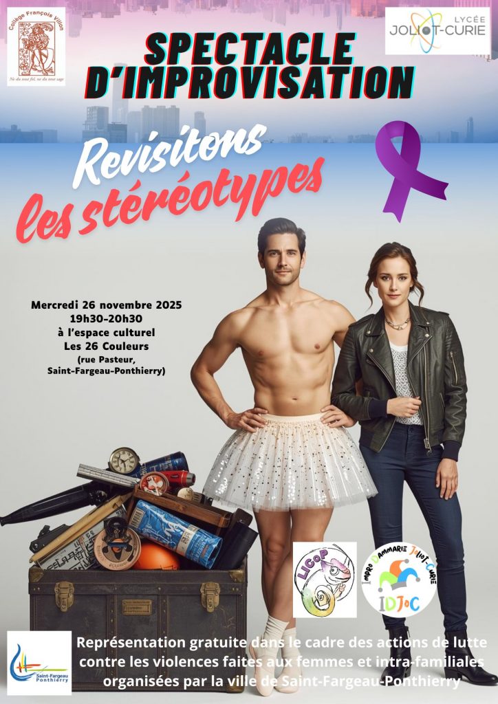 Le mercredi 26 novembre 2025 et pour la troisième année consécutive dans le cadre de la journée internationale de Lutte contre les violences faites aux femmes et intra-familiales, les élèves du club d’Impro Dammarie Joliot-Curie (IDJoC) ont eu l’honneur de jouer sur la scène de la salle Catherine Deneuve de l’espace culturel des 26 Couleurs de Saint-Fargeau-Ponthierry aux côtés des élèves de la Ligue d’Improvisation du Collège de Ponthierry (LICoP). Leur mission : sensibiliser les spectateurs sur les stéréotypes de genre calqués sur les filles et les garçons dès la petite enfance.