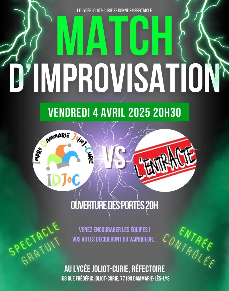 Le vendredi 4 avril 2025, les élèves du club d’Impro du lycée (IDJoC) ont eu le plaisir de rencontrer à domicile la troupe associative dammarienne de L’Entracte pour un match retour. Après une première rencontre le 14 janvier, il était temps de jouer la revanche.