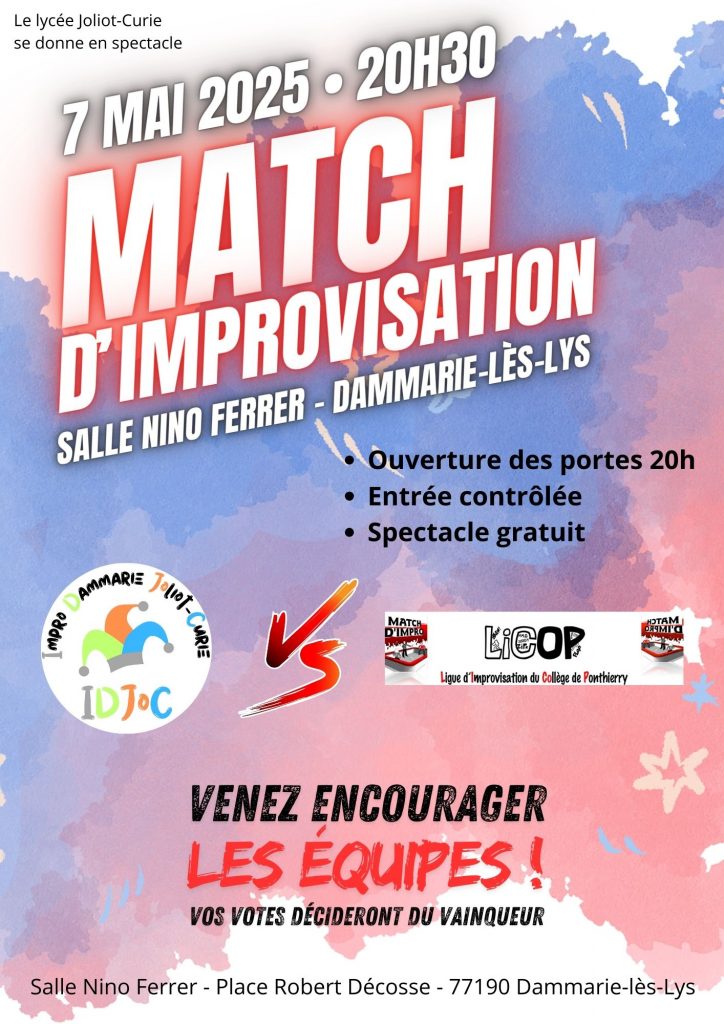 Le mercredi 7 mai 2025, les élèves du club d’Impro du lycée (IDJoC) ont eu le plaisir de rencontrer la troupe d’impro du collège François Villon de Saint-Fargeau-Ponthierry pour un match aller se déroulant à la salle Nino Ferrer de Dammarie-lès-Lys.