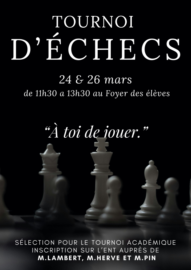le lycée Joliot Curie organise un nouveau tournoi d’échecs les 24 et 26 mars de 11h30 a 13h30.